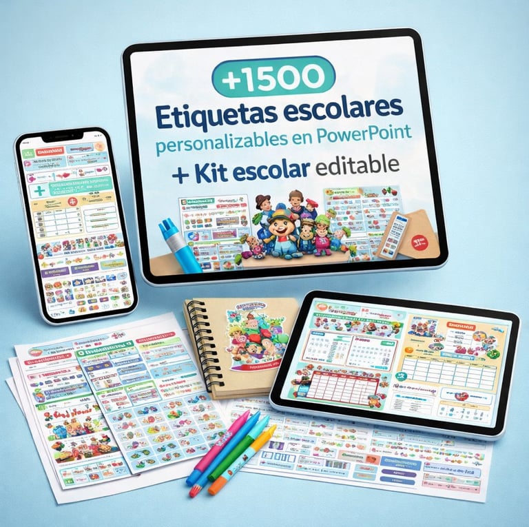+1500 Etiquetas escolares (para lápices, cuadernos, borradores, etc.) personalizables en Powerpoint + Kit escolar (carátulas, tablas de multiplicar, etc.) editable en Canva.